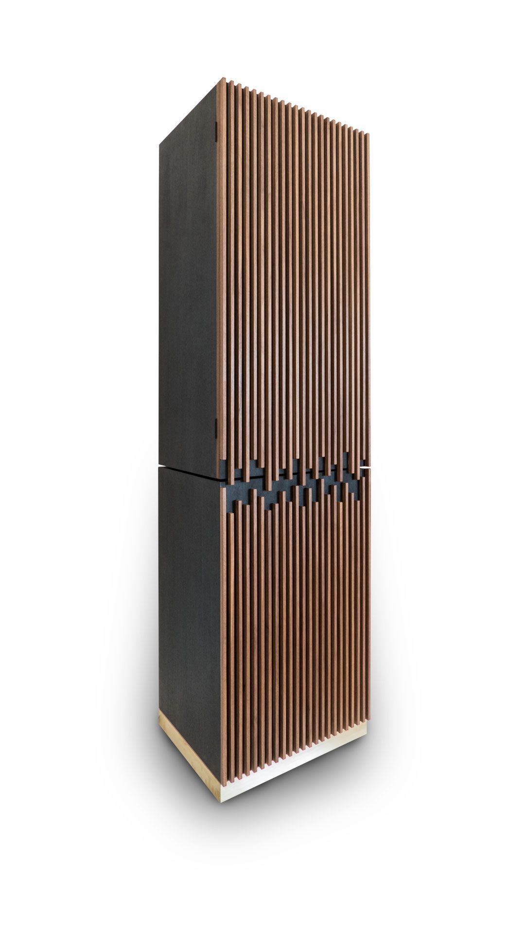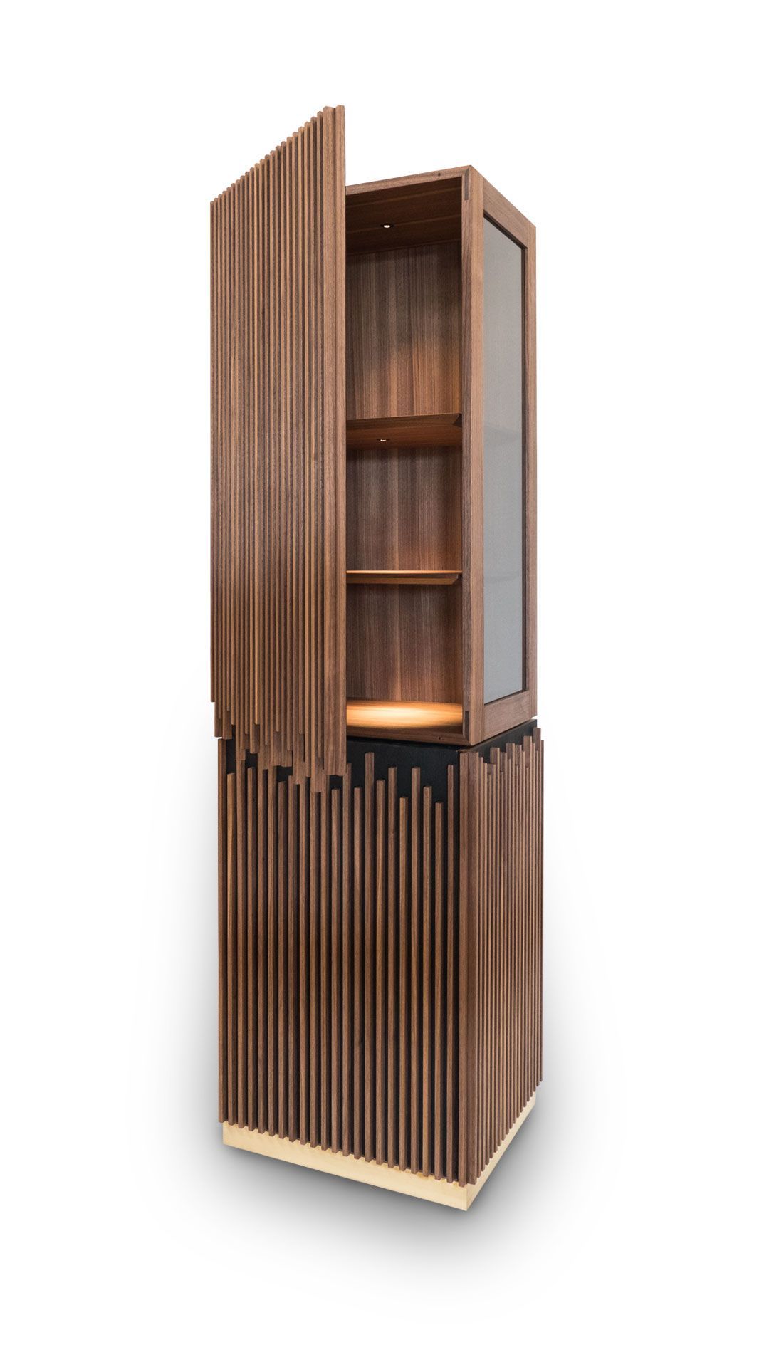 Beinahe schon einen skulpturartigen Charakter hat das Gesellenstück unseres Auszubildenden Maximilian Weichenberger. Sein Barschrank aus Nussbaum besticht durch eine ineinanderfließende filigrane Leistenoptik, die einen schönen Kontrast zur dunkel gebeizten Oberfläche der Korpusaußenseite bildet. Ein goldfarbener Sockel aus Messing lässt diese Barsäule besonders edel wirken.